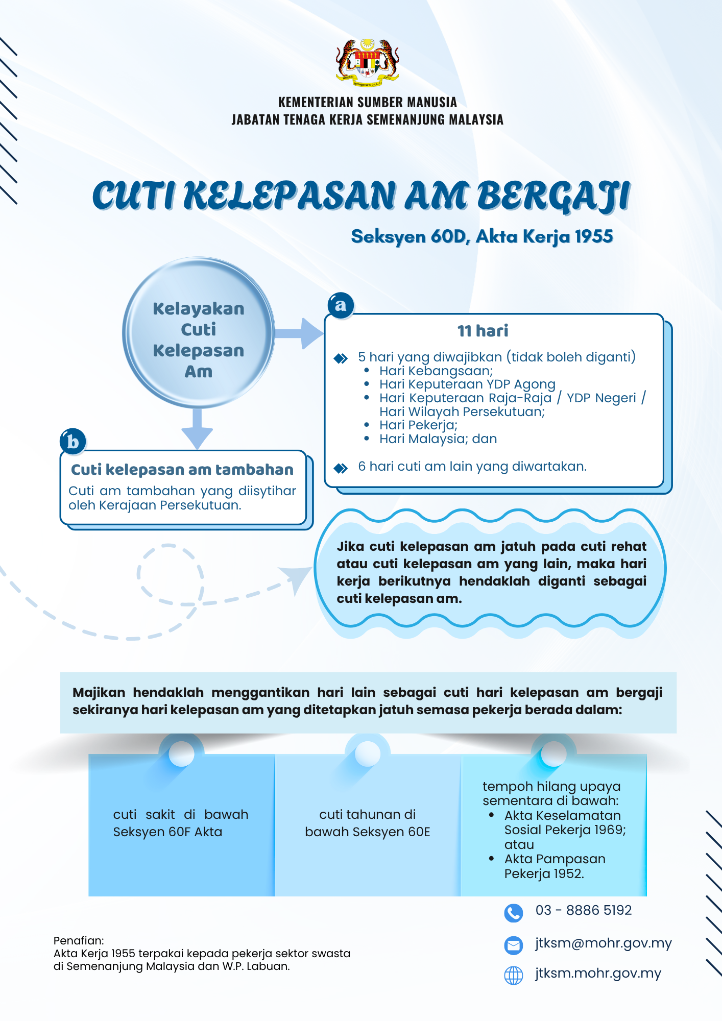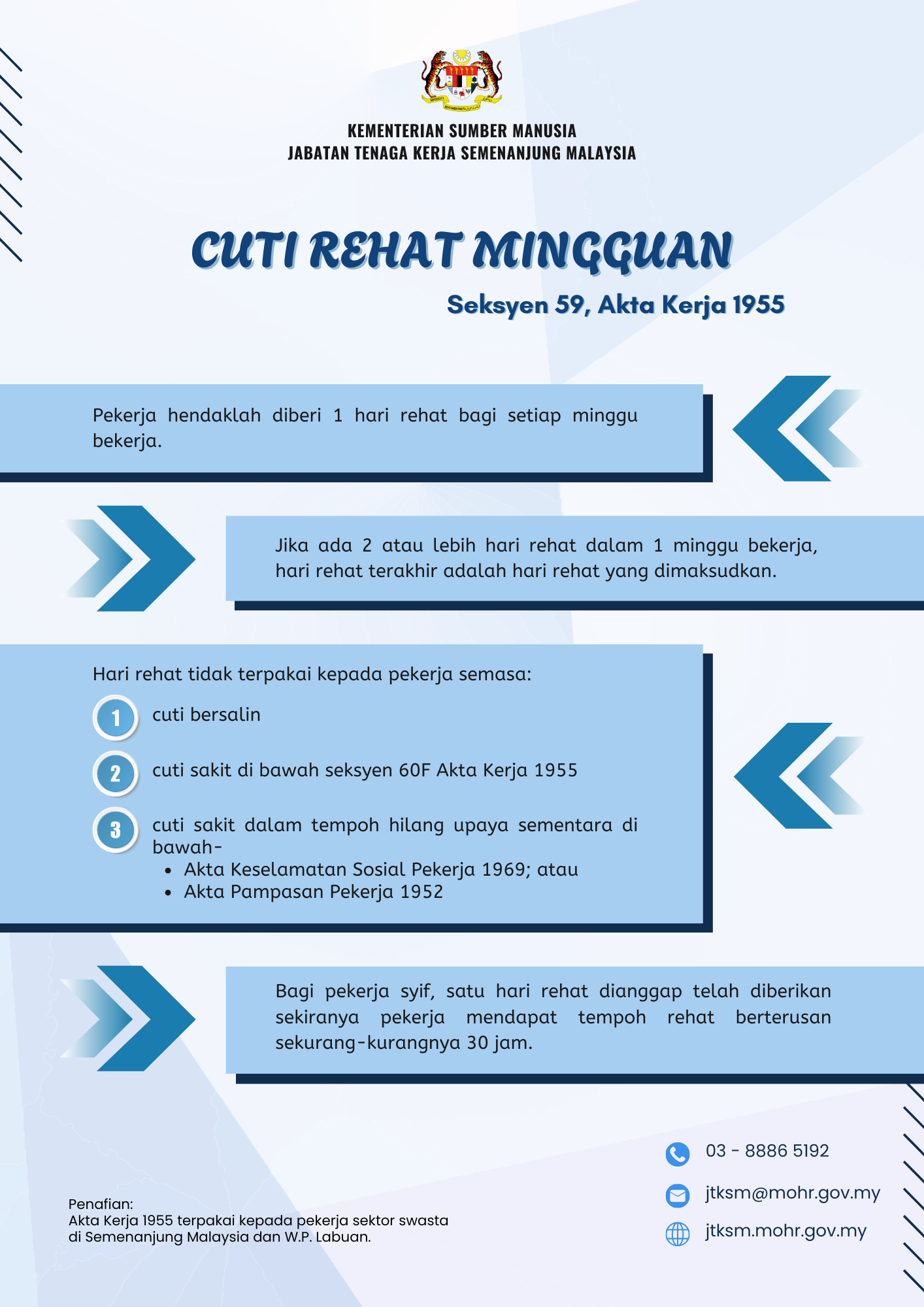 PDF Interaktif Tanggungjawab Majikan Kepada Pekerja Domestik Asing (PDA)Di Bawah Akta Kerja 1955 PDF Interaktif Cuti Kelepasan Am Bergaji PDF Interaktif Cuti Rehat Mingguan PDF Interaktif Cuti Tahunan Bergaji PDF Interaktif Cuti Sakit Bergaji PDF Interaktif RIGHTS OF FOREIGN EMPLOYEES IN MALAYSIA PDF Interaktif Garis Panduan Pelaksanaan Aturan Kerja Fleksibel PDF Interaktif Aturan Kerja Fleksibel PDF Interaktif Diskriminasi Dalam Pekerjaan PDF Interaktif Kontraktor Untuk Buruh PDF Interaktif Notis Larangan Gangguan Seksual PDF Interaktif Garis Panduan untuk Mencegah dan Membasmi Amalan Buruh Paksa di Tempat Pekerjaan PDF Interaktif Pekerja Kanak-Kanak & Orang Muda PDF Interaktif Cuti di bawah Akta Kerja 1955 PDF Interaktif Perlindungan Wanita Hamil dan Bersalin: Akta Kerja (Pindaan) 2022 PDF Interaktif Waktu Bekerja: Akta Kerja (Pindaan) 2022 PDF Interaktif Akta Kerja (Pindaan) 2022 PDF Interaktif Lesen Akta Agensi Pekerjaan Swasta 1981 [Akta 246] PDF Interaktif Terma-terma dan Syarat-syarat Pekerjaan PDF Interaktif Buruh Paksa PDF Interaktif Buruh Paksa di Tempat Pekerjaan (Poster) PDF Interaktif Umur Persaraan Minimum PDF Interaktif Penginapan Pekerja PDF Interaktif Panduan Mengendalikan Isu-isu Berhubung Wabak Berjangkit Termasuk Novel Coronavirus di Tempat Kerja PDF Interaktif Piawaian Pengelasan Pekerjaan Malaysia 2020 PDF Interaktif Panduan Gaji Permulaan 160 Pekerjaan Terpilih Berdasarkan Kemahiran Edisi Pertama (2016) PDF Interaktif Garis Panduan Menunaikan Solat Dalam Waktu Kerja (Versi Bahasa Melayu) PDF Interaktif Masalah Di Tempat Kerja PDF Interaktif Sistem Insurans Pekerjaan PDF Interaktif Malaysia Standard Industrial Classification (MSIC) 2008 PDF Interaktif Garis Panduan Pengurusan Pemberhentian Pekerja PDF Interaktif Garis Panduan Dan Tip Untuk Majikan Pekhidmat Domestik Asing